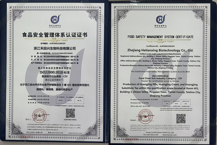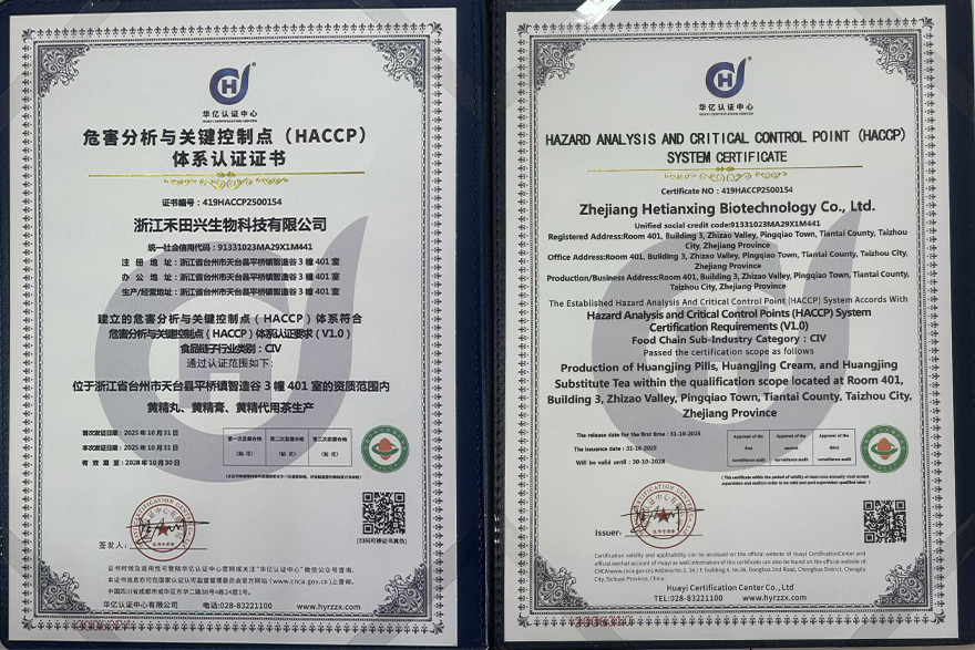 近日,浙江禾田兴生物科技有限公司迎来重要时刻——公司旗下黄精丸、黄精膏、黄精代用茶等核心产品,正式通过HACCP(危害分析与关键控制点)体系与ISO 22000:2018食品安全管理体系双重认证,并于2025年10月31日获得认证证书。